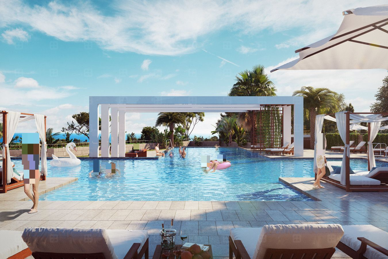 Большой закрытый жилой комплекс "Морская Симфония" с большим открытым бассейном, смотровой площадкой с видом на море, детские площадки, фонтан с подсветкой, теннисный корт, спортивные площадки, фитнес.
